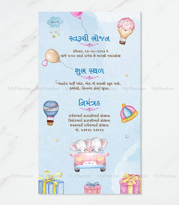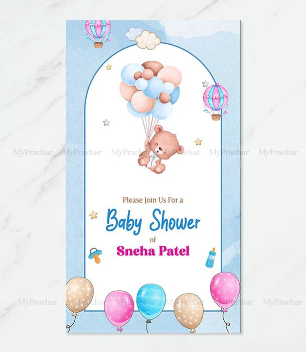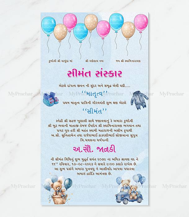 Balloons & Blessings Baby Shower Invitation: Â Celebrate the joyous occasion with our ‘Balloons & Blessings’ Baby Shower Invitation Card, designed with love and vibrant Gujarati touches. Perfect for inviting friends and family to welcome the little one with balloons, gifts, and heartfelt blessings.