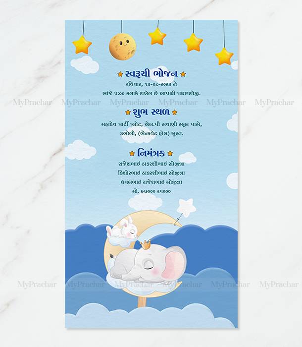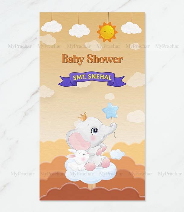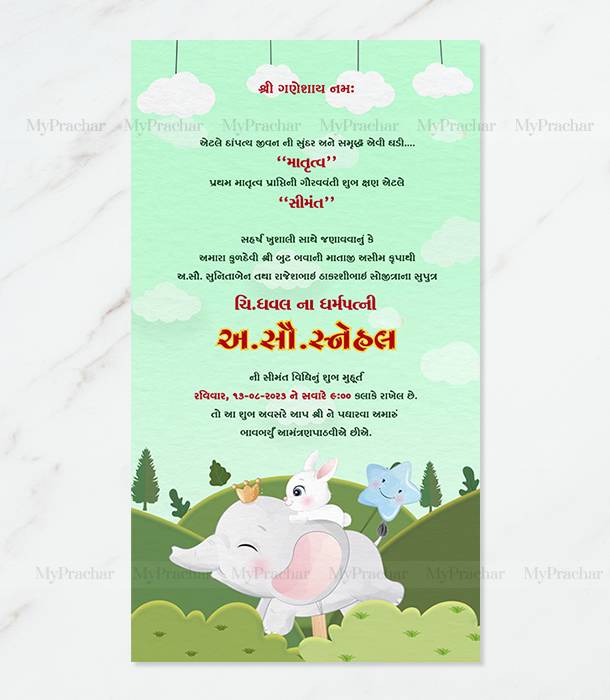 Dreamy Elephant Baby Shower Invitation: Invite loved ones to celebrate with our ‘Dreamy Elephant’ Baby Shower Invitation in Gujarati. A charming design filled with whimsy and warmth, perfect for welcoming your little one.