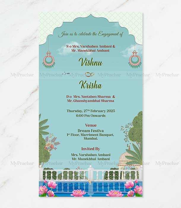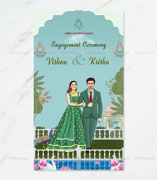 Royal Arch Pichwai theme Engagement Invitation Card with Caricature in Gujarati, English, & Hindi – Memorable and Fun Invitations