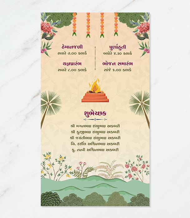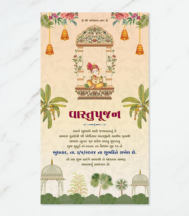 Vastu Pujan House Warming Invitation Card in Gujarati, English, and Hindi with Vastu Shanti Design