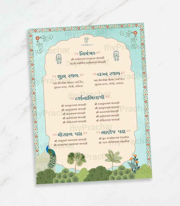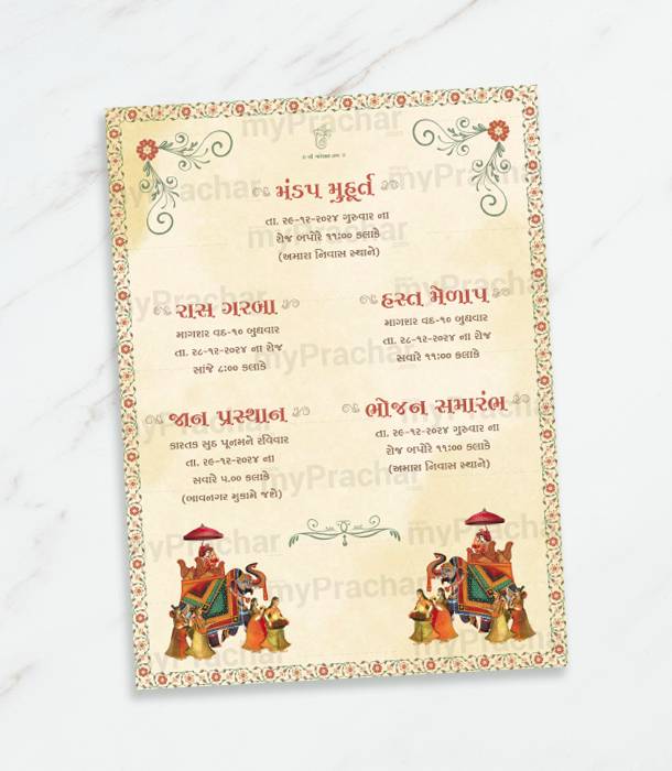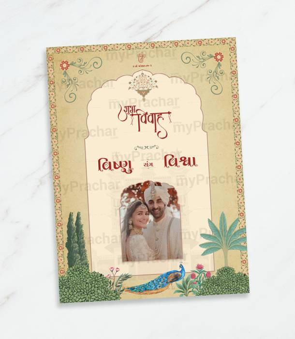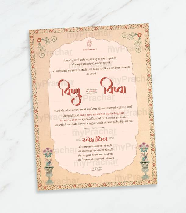 Traditional Theme Wedding Invitation Card with Gujarati, Hindi, and English Language Options
