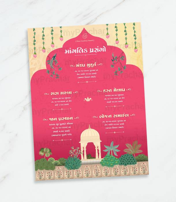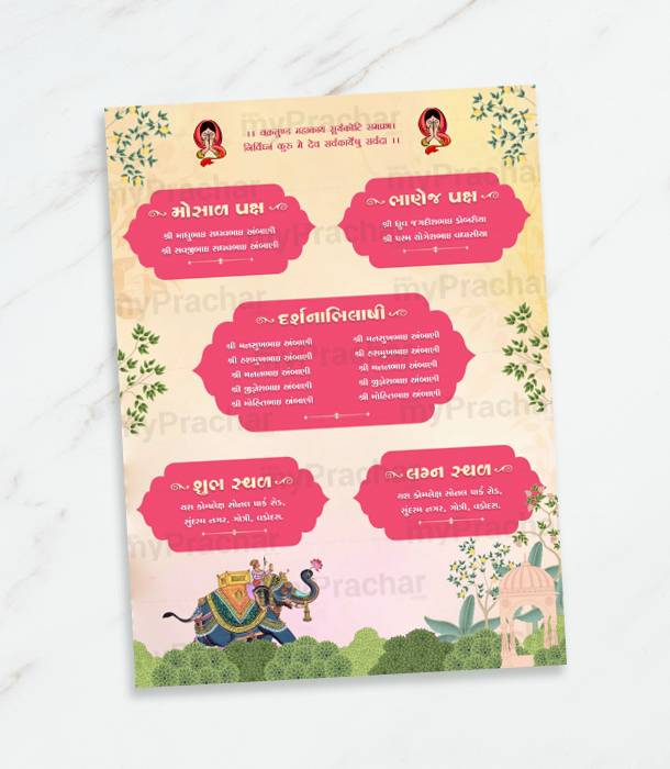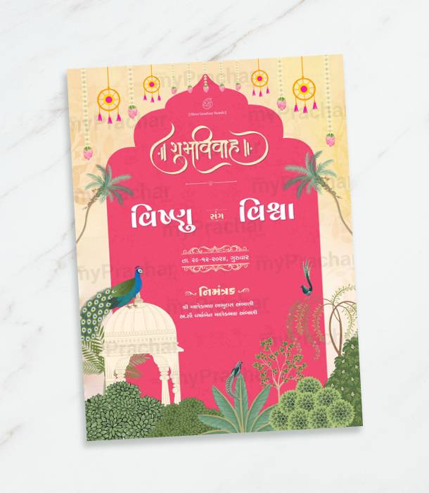 Invite guests to your special day with our Traditional Indian Pink Wedding Invitation Card, available in Gujarati, Hindi, and English. Perfect for celebrating cultural heritage and creating lasting memories.