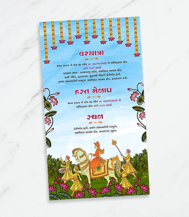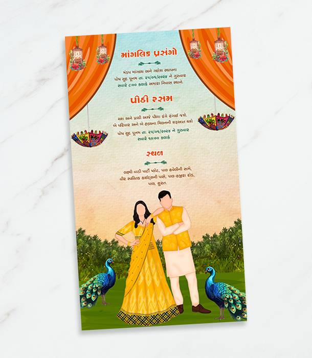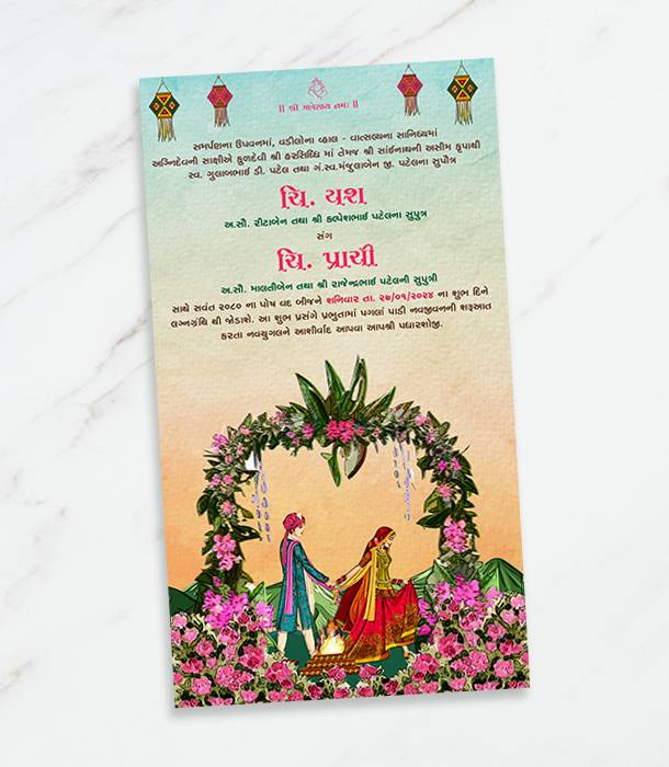 Traditional Wedding Invitation Card with Gujarati, Hindi, and English Language Options