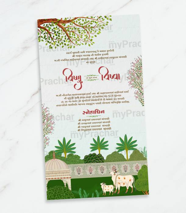 Invite guests to your special day with our Traditional Indian Krishna Theme Wedding Invitation Card, available in Gujarati, Hindi, and English. Perfect for celebrating cultural heritage and creating lasting memories.
