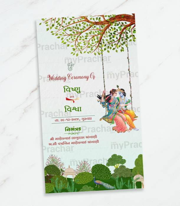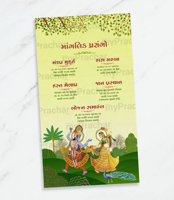 Traditional Krishna Theme Wedding Invitation Card with Gujarati, Hindi, and English Language Options